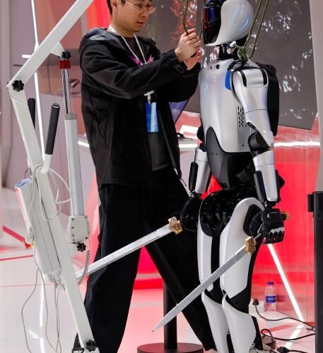 En las instalaciones en la feria de la compañía AgiBot, con sede en Shangái, un robot humanoide bailarín llamado X2 fascina a los asistentes con una coreografía extraída de un videoclip de la red, pero su abanico de movimientos es extenso: puede incluso hacer kung fu.